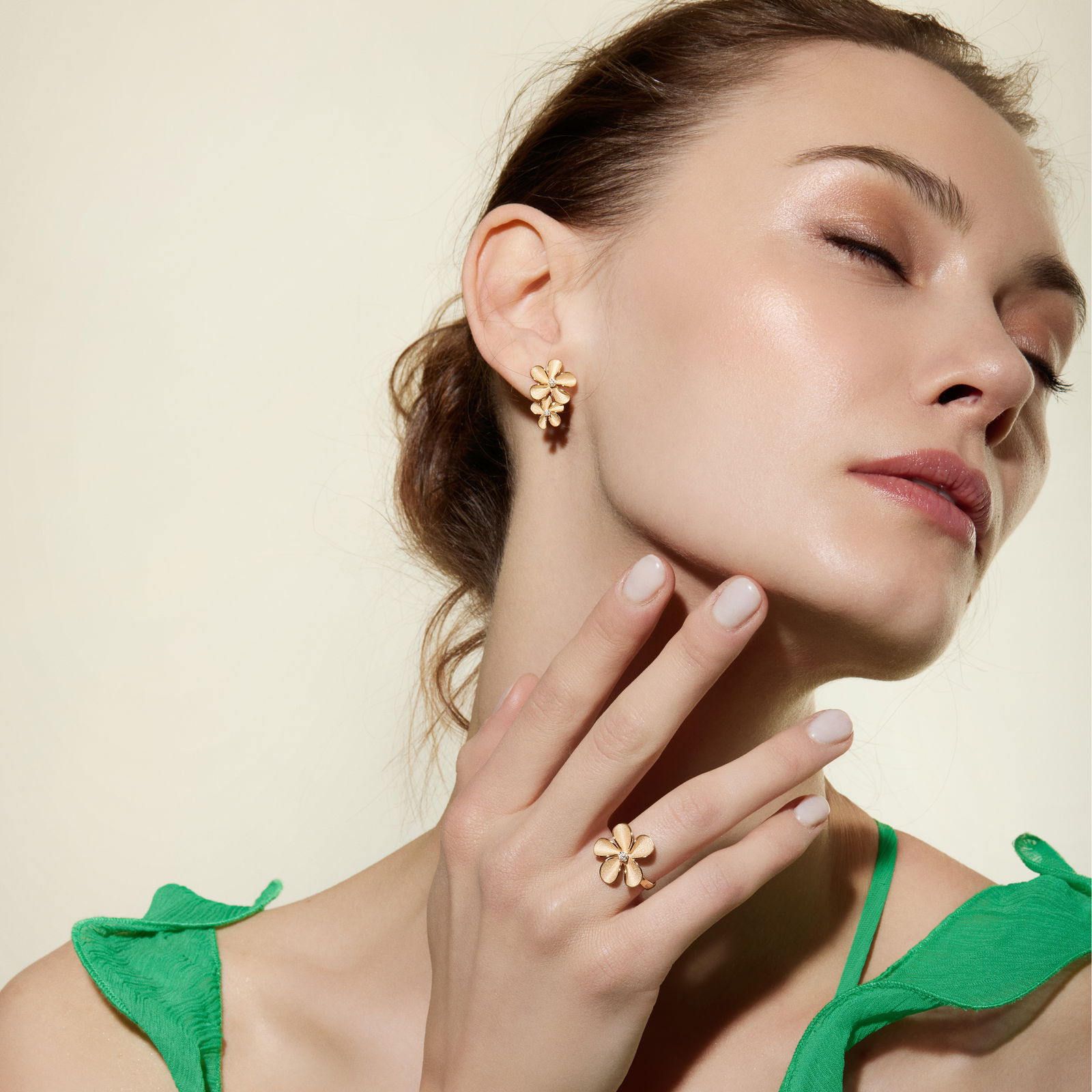 Gefertigt aus 18 Karat Gold in acht exklusiven Nuancen, kombiniert Cherry Bloom satiniert-matte Oberflächen mit glänzenden Kanten. Dezente Diamanten setzen funkelnde Akzente und betonen die florale Ästhetik. Jedes Stück ist ein Meisterwerk der Goldschmiedekunst, das die natürliche Schönheit der Kirschblüte in edlem Schmuck widerspiegelt.